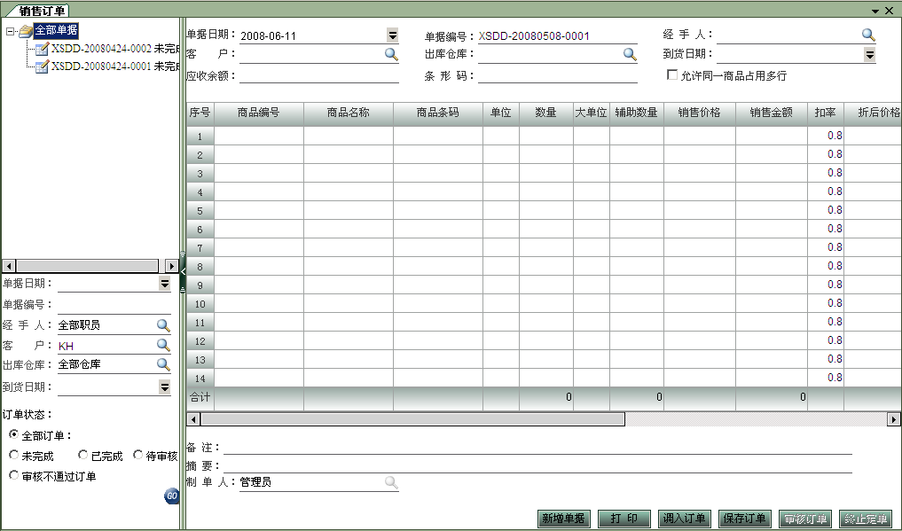 · 訂單中必須錄入的項(xiàng)目: 訂單必須錄入訂貨客戶、經(jīng)辦人、銷售訂貨商品名稱、數(shù)量、單價(jià)(金額)。其它項(xiàng)目的錄入有利于更方便、更的查詢與統(tǒng)計(jì),但不是必須項(xiàng)。